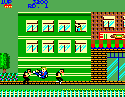 É assim o My Hero. Um beat ‘em up à moda antiga, com 1-hit kills para ambos os lados, excepto nas lutas contra os bosses, onde o jogo adopta uma mecânica mais na onda de um Street Fighter muito embrionário. É um jogo desafiante, que obriga a conhecer os níveis como a palma da mão (o que não é muito difícil ao fim de algum tempo), bem como ter uma boa destreza de dedos, pois os inimigos vêm aos magotes, e há um ou outro que é um pouco complicado de desviar ou derrotar. Fora isso, não é um jogo que me agrade particularmente em jogar, pois não sou grande fã de jogos intermináveis. Já não me lembro qual foi o nível máximo que cheguei, talvez ao 10º nível ou afins. Uma outra funcionalidade que este jogo tem é o suporte a 2 jogadores. Infelizmente não é para se jogar ao mesmo tempo, mas sim por turnos, algo que não era muito incomum na altura. Em relação à história, é o habitual. Estava um gajo a passear pela cidade com a sua miúda, quando o líder de um gang a rapta mesmo debaixo das nossas barbas. Solução? Vocês sabem.