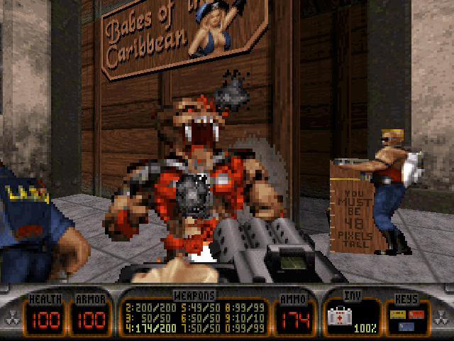 Apesar de não ser a primeira aventura do herói (existem 2 jogos de plataformas para PC), Duke 3D foi o jogo que lhe deu todo o carisma: Humor negro, sexo, drogas e rock n’ roll. Apesar de hoje em dia não ser incomum encontrar strippers, palavrões e violência em jogos de vídeo, para os padrões de 1996 era algo chocante. E logo eu que comecei a jogar FPS nessa altura… Mas não foi só pela polémica que Duke 3D foi um jogo de grande sucesso: Os níveis estão muito bem construídos, ambientes bastante variados e com um elevado grau de interactividade que na altura não era habitual: desde jogar bilhar, ver câmaras de segurança, trocar bitaites com NPCs (maioritariamente mulheres), karaoke, etc. O jogo está também repleto de referências cinematográficas, de outros videojogos ou até de pop-culture. Em zonas secretas encontramos personagens mortas como Indiana Jones, Luke Skywalker, e até o Space-Marine de Doom. Monstros espaciais que lembram os face huggers de Aliens, o carisma dos Pig-Cops, mapas passados em cinemas para adultos, restaurantes chineses, no espaço, em super-mercados, parques de diversões, numa cadeia que lembra os “Renegados de Shawshank”, etc etc etc. Tudo motivos que fizeram com que o Duke 3D fosse um dos FPS mais bem sucedidos do seu tempo.