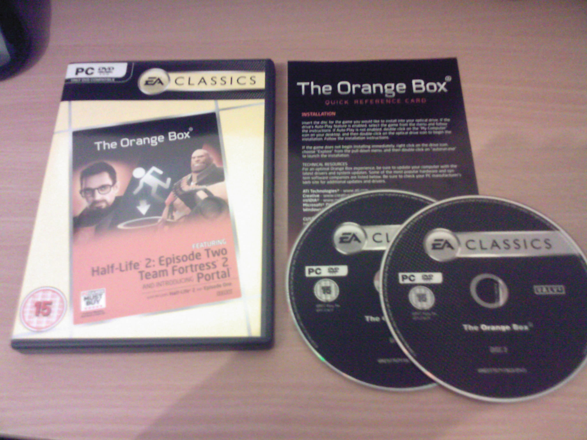 Bom, esta será a primeira análise que faço de uma colectânea, e como esta é uma colectânea e pêras prefiro fazer um artigo para cada jogo da mesma. The Orange Box é possivelmente a melhor compilação que resolveram lançar nos últimos anos, especialmente tendo em conta os preços reduzidos que hoje em dia se encontra por aí. The Orange Box inclui o Half-Life 2, incluindo os seus 2 episódios posteriormente lançados (Episode I e II respectivamente), o hit multiplayer Team Fortress 2 que hoje em dia se pode jogar gratuitamente e o fenómeno Portal, jogo que toda a gente comenta por essa internet fora e eu ainda não o tinha jogado. Para além do mais, a box possibilita também o download do Half-Life 2: Lost Coast, um simples nível que é pouco mais que uma demo técnica do que a já velhinha engine Source ainda é capaz de fazer. Este Lost Coast será o único “jogo” que não irei comentar no futuro. A minha cópia da caixa laranja foi adquirida no ebay há umas semanas atrás, tendo-me custado algo em torno de 15€. Na verdade senti-me um pouco enganado pois a foto do produto era a da versão normal e saiu-me esta “EA Classics”… não me quis chatear e ficou assim.