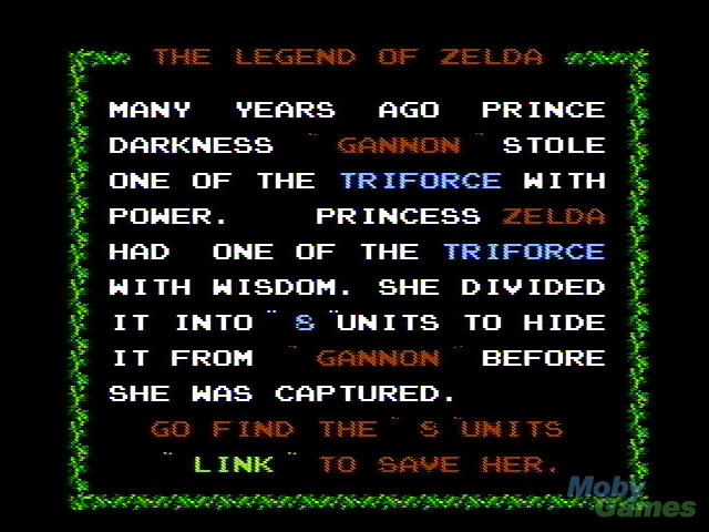 O primeiro The Legend of Zelda foi lançado originalmente no ano de 1986, curiosamente o mesmo ano em que nasci, tendo sido um marco em vários aspectos, conforme poderei referir. Em primeiro lugar, como de costume, falemos da história. The Legend of Zelda (TLoZ daqui em diante) coloca-nos no reino fantasioso de Hyrule, mais precisamente no papel de um jovem rapaz chamado Link, com a sua icónica vestimenta verde. Ora Hyrule foi invadida por um vilão chamado Ganon (falemos de Ganondorf noutra altura), tendo roubado a Triforce of Power, um objecto mágico de grande poder. A princesa de Hyrule, Zelda tinha em suas mãos a segunda parte da Triforce, a Triforce of Wisdom. Para evitar que Ganon a adquirisse, Zelda partiu-a em 8 pedaços e espalhou-os em vários pontos de Hyrule, antes de ser raptada pelo próprio Ganon. A certa altura Link vem a saber desses acontecimentos e parte à aventura à procura da Triforce of Wisdom, acabar com o reinado de terror de Ganon e resgatar Zelda. Curiosamente, neste primeiro jogo ainda não é mencionada a terceira parte da Triforce, Triforce of Courage, que habitualmente costuma ficar ligada ao próprio Link.