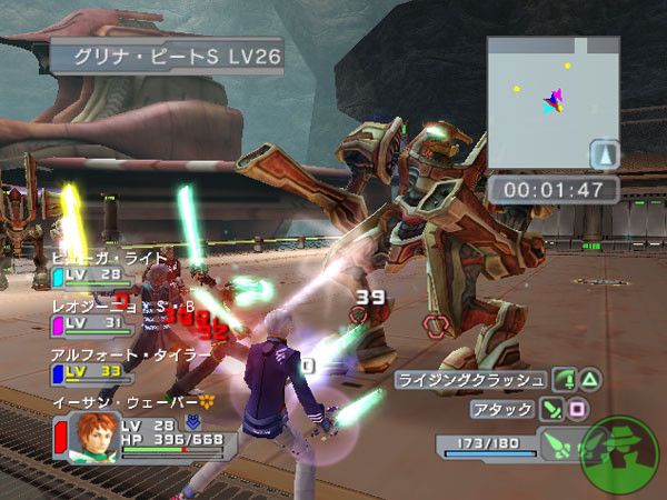 Inicialmente podemos experimentar dois modos de jogo: Story e Network. O Story é auto explanatório, onde vivemos a história que PSU tem para oferecer, já no segundo modo é algo semelhante ao Phantasy Star Online, onde temos a liberdade para criar uma personagem à nossa medida, e depois poderemos explorar o mundo à vontade, com uma party de até 4 jogadores. Sinceramente não cheguei a experimentar este modo, pois os servidores da PS2 estão desligados há muito tempo. Após algum tempo no modo história também desbloqueamos o extra mode, que a meu ver é algo semelhante ao network mode, mas offline. Criamos uma personagem e podemos fazer algumas quests que também existem no story mode. Agora se podemos usar essa personagem para o jogo online sinceramente não o sei, mas por uma questão de segurança a nível de hacks/cheats suponho que não seja possível. Sei que podemos importar a personagem do extra mode para o modo offline da expansão Ambition of the Illuminus, coisa que eu fiz e estou a jogar de momento. Uma diferença muito grande face ao PSO é que apenas podemos escolher a raça da nossa personagem, já a “classe” (Hunter para combate directo, Ranger para combate à distância e Force para uso de magias) é algo que podemos alternar sempre que quisermos. Outra diferença face ao PSO e que os fãs desgostaram é a exclusão do sistema de Mags, pequenos aparelhos que nos acompanhavam nos combates, que os poderíamos alimentar com diversos items, o que os faria ter características diferentes no auxílio à personagem. Aqui os Mags foram de certa forma substituídos pelas partner machines, uns robozinhos que estão no nosso quartinho que para além de servirem de storage de items, permitem também a criação de novos items, uma espécie de alquimia moderna, onde através do uso de boards e alguns items que podem ser encontrados no jogo ou comprados em lojas, permitem a criação de outros items ou equipamento. Essas partner machines também podem ser alimentadas à semelhança dos Mags, e chegando a um nível máximo podem vir a ser seleccionados na party, combatendo ao lado do jogador.