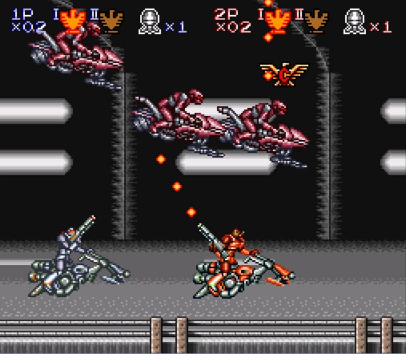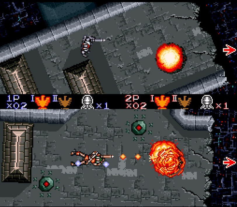 Infelizmente o jogo apesar de ser intenso, é um pouco curto, tendo só 6 níveis. Dois desses níveis jogam-se com uma perspectiva aérea, onde temos de destruir uns quantos “monster generators“. Os controlos são diferentes, aqui a personagem está estática no ecrã, onde utilizamos os botões L e R para rodar o cenário, fazendo uso das capacidade Mode 7 da SNES. E dos sidescrollers, há um nível particularmente intenso em que conduzimos a alta velocidade numa moto por uma auto estrada, disparando em tudo o que mexa, culminando numa batalha aérea contra um boss gigante, saltando de míssil em míssil. Um momento Contra bastante memorável. Também não podia deixar de referir o modo para 2 jogadores, que nestes níveis em top-down view se joga com um split-screen horizontal.