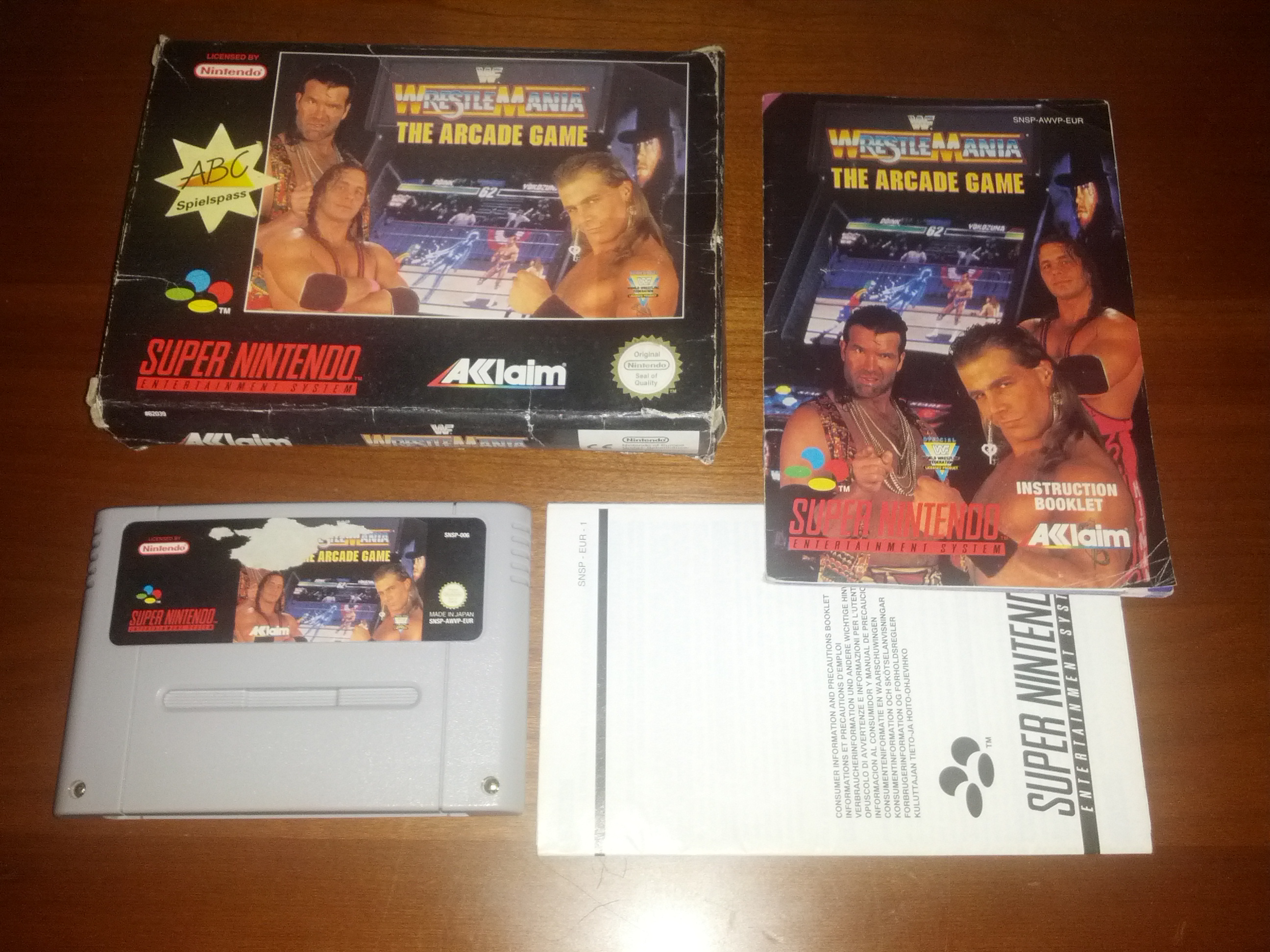 Não sou fã de wrestling. Talvez tenha sido um pouco quando andava na escola primária e a RTP transmitia alguns combates ao Sábado, bem como umas séries animadas com o Hulk Hogan. Mas mais do que isso nunca fui. E como tal os videojogos baseados em wrestling também nunca foram a minha praia, pelo que este será um artigo mais rápido. Este Wrestlemania The Arcade Game foi un jogo lançado originalmente nas arcades, produzido pela Midway, a mesma empresa que nos trouxe Mortal Kombat. E tal como Mortal Kombat está repleto de lutadores digitalizados e as versões caseiras deste jogo sairam para uma panóplia de diferentes sistemas. A minha versão veio junto com um bundle SNES que comprei a um colega de trabalho, tendo-me ficado barato no total. Está completo e relativamente em bom estado tendo em conta que estamos a falar de caixas SNES.