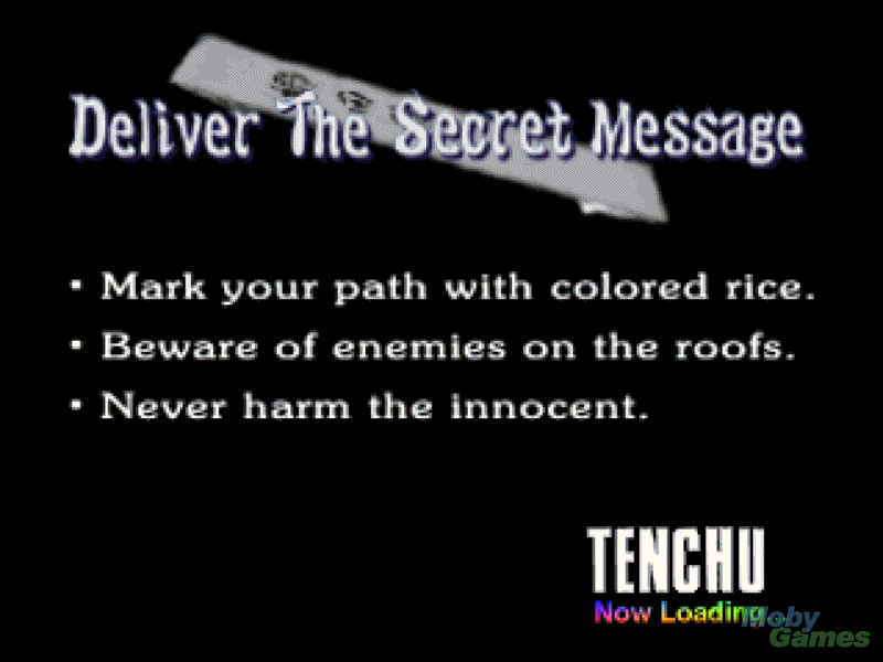Tal como referi acima, a diferença que Tenchu fazia face aos jogos anteriores sobre esta temática é mesmo o stealth. Todos os níveis são passados à noite ou em locais escuros, o que provoca um mau campo de visão para toda a gente, e teremos de tirar o melhor partido do mesmo. Um dos items que podemos carregar é um gancho que podemos usar para nos colocarmos em telhados, sendo isso mais uma mais-valia para passarmos despercebidos. E de facto convém evitar que os adversários nos descubram, de forma a podermos assassiná-los pelas costas, com golpes duros, mas eficazes. Caso sejamos descobertos, e em especial se jogarmos com a Ayame, que é fisicamente mais fraca, teremos a vida mais complicada e demoramos bem mais tempo a matar algum dos nossos adversários, para além de tambem sofrermos muito mais dano. Tal como em Metal Gear Solid, sem dúvida o grande jogo do género stealth para a consola, temos um indicador “de segurança”, que muda consoante formos descobertos, ou depois de nos escondermos, quanto tempo falta até os inimigos que nos descobriram desistirem de ir atrás de nós.