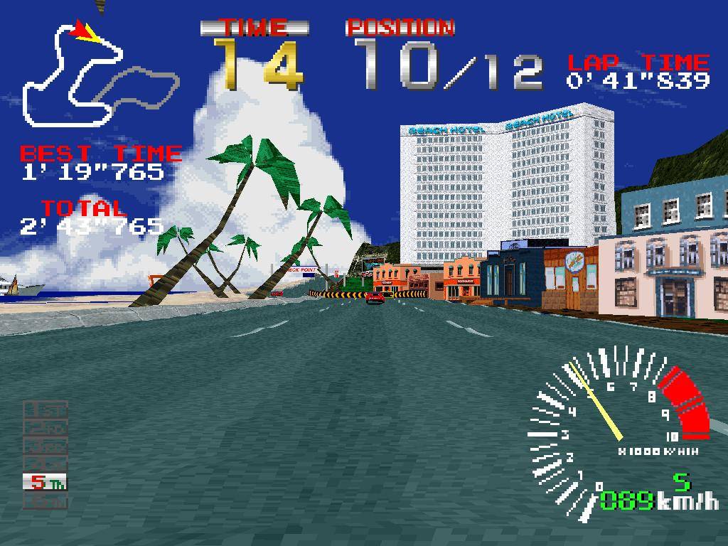 Ora vamos lá. Ligando o jogo, depois de jogarmos um pouco de Galaxian no ecrã de loading (sempre gostei deste toque especial que a Namco deixou nos seus jogos), resta-nos escolher o carro a conduzir, as mudanças manuais ou automáticas, a música e o “circuito”. As aspas estão ali porque na realidade todos os circuitos são variantes do mesmo, mudando apenas com a dificuldade. O primeiro grau de dificuldade – beginner – leva-nos pelo circuito normal com uma velocidade limitada, onde apenas precisamos de fazer 2 voltas. O grau seguinte deixa-nos no mesmo circuito, mas o limite de velocidade é maior, e teremos 3 voltas pela frente. O “hard” leva-nos pelo circuito extendido, onde teremos uma parte nova do percurso, através de trechos de estrada ainda em construção. Por fim temos o Time Trial, mas já lá vamos. Nos primeiros 3 que mencionei, existem 12 carros na corrida, incluindo nós mesmos, começamos na última posição e o resto é simples, correr em contra relógio através de vários checkpoints e fazer tudo por tudo para chegar ao final da corrida em primeiro. O Time Trial é diferente, é uma corrida 1 contra 1, nomeadamente contra o “melhor” carro do jogo, no mesmo circuito extendido. Finalizando em primeiro lugar nestas 4 pistas, temos acesso a jogá-las novamente no modo reverso.