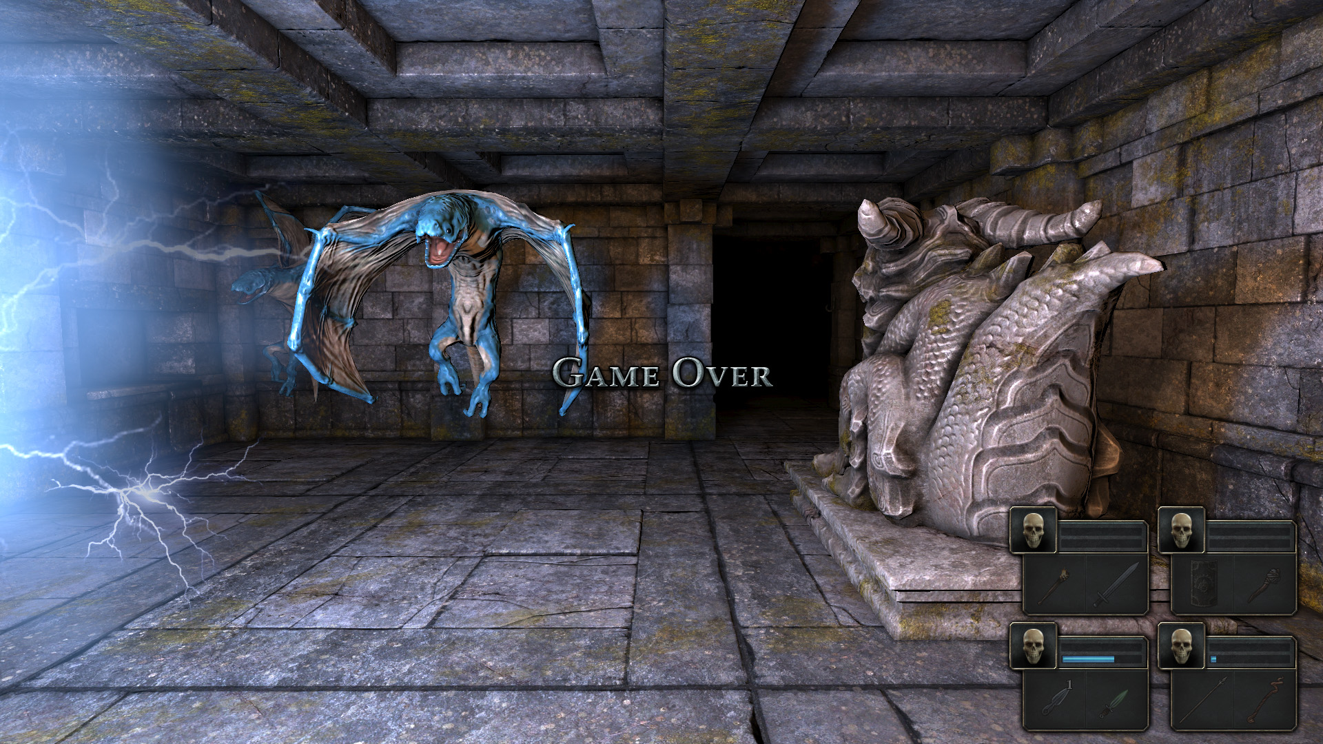 Inicialmente somos dados a escolher a nossa party, que poderá ter de 1 a 4 elementos, com diferentes classes e/ou raças, que por sua vez possuem diferentes atributos. Existem 3 classes diferentes, os lutadores, fisicamente portentosos e óptimos para combates melee e ficarem na fila da frente, e temos também os feiticeiros, dotados de poderes mágicos e os rogues, com mais flexibilidade para ataques de longa distância ou mais sneaky com “assassination skills”. Existem também 4 raças como os humanos, minotauros, insectoids e lizardmen, mas sinceramente apenas usei humanos no meu jogo. A história deste Legend of Grimrock é simples. A nossa party foi acusada de crimes contra o rei lá do sítio e foram atirados do cume do Monte Grimrock para a sua dungeon labiríntica. Dizem que se a party conseguir atravessar toda a dungeon os seus crimes serão perdoados, mas até ao momento nunca ninguém havia voltado. À medida em que vamos explorando o sítio vamo-nos apercebendo também que não estamos sozinhos. Uma voz assombra-nos os sonhos dizendo que se chegarmos ao final da dungeon existe um portal que nos transporta de volta para o mundo exterior e também vamos vendo mensagens deixadas por outro explorador da caverna chamado Toorum, que nos vai alertando para para os puzzles e outros perigos que vamos encontrando.