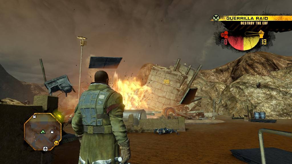Como qualquer jogo sandbox que se preze, temos um inteiro mapa à nossa disposição para explorar, embora seja apenas recomendado que exploremos as áreas que estamos em vias de libertar do controlo da EDF, visto as restantes áreas ocupadas ainda serem algo perigosas. E para além de todas as story missions teremos muitas missões de géneros variados a cumprir se o quisermos. Essas missões podem ser apenas para resgatar reféns, assaltar alguns edifícios da EDF, roubar certos veículos e transportá-los para uma safehouse, ou defender um certo ponto de várias waves de tropas da EDF. Tal como nos jogos anteriores a série Red Faction sempre foi popular pela sua característica “geomod”, ou seja, pela capacidade de podermos destruir os cenários. Aqui as coisas foram levadas a um outro nível e realmente podemos destruir por completo qualquer edifício que seja, embora a física das coisas por vezes não seja a melhor. Por exemplo, é possível destruir vários pilares essenciais de um edifício, deixando-o pendurado por uma nesga e mesmo assim não cair. De qualquer das formas não deixa de ser uma sensação agradável deixar uma série de detonation charges em pontos certos e detoná-las quando alguns pobres soldados passam lá perto, deixando um rasto de destruição. Outras das missões secundárias são mesmo desafios de demolições, onde apenas munidos de algumas detonation charges ou outros explosivos teremos de mandar abaixo alguma infrastrutura num determinado intervalo de tempo.