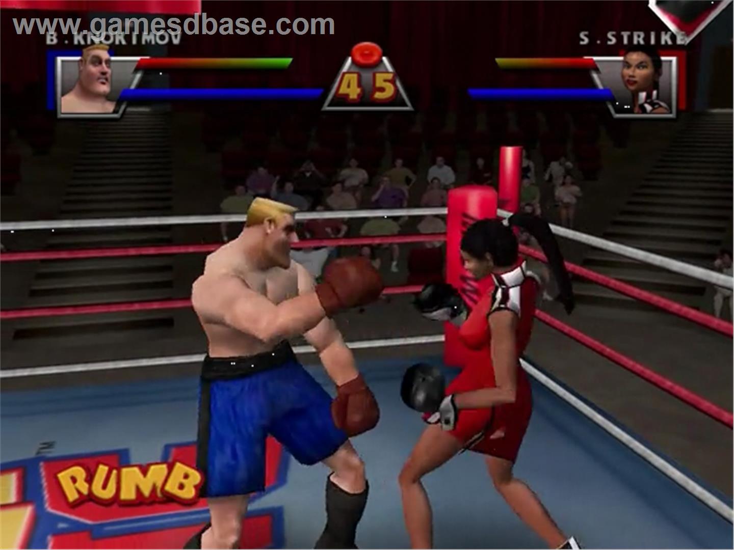 Como devem ter percebido pelo título do jogo, estamos diante de um jogo de boxe. E só de olhar para a capa e ver o aspecto cómico dos atletas, depreendemos também que não se trata de um simulador mas algo mais arcade, caso contrário nem o teria comprado. Dispomos apenas de 2 modos de jogo, o arcade que dispensa apresentações, mas que também poderá ser jogado em versus para 2 jogadores, e o Championship, que já lá vamos. A jogabilidade é simples, com cada botão a representar um soco diferente, mas também se for utilizado em conjunto com uma direcção dada pelo d-pad ou pelo analógico traduz-se em golpes mais fortes, porém mais lentos. Os botões de cabeceira servem para bloquear, ou se utilizados em conjunto com o direccional ou analógico, fazem com que nos desviemos para a direcção pretendida. Com cada golpe mais duro que acertemos em cheio no oponente, vão-nos aparecer letras que vão completando a palavra RUMBLE. Quando a mesma estiver completa, podemos activar o Rumble Mode, onde os nossos socos se tornam temporariamente mais poderosos e podemos também desencadear algumas combos mais bonitinhas.