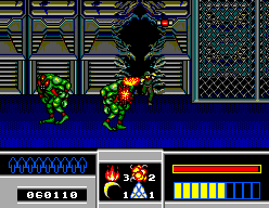 Depois cá está: o original da Arcade parecia-me ser um jogo espectacular, com gráficos bem detalhados e mesmo que seja um bocadinho clone de Alien pareceu-me ser muito porreiro. O pouco que tinha jogado da versão Master System anteriormente também me deixou com boa impressão, pois achei o jogo bem detalhado. Mas a minha memória pregou-me uma grande partida, pois apesar de os monstros estarem bem detalhados, as suas animações ficaram mesmo horríveis, com dois ou três frames apenas. Terão sido as cutscenes entre cada nível que me tenham iludido há uns anos atrás? Pois essas continuo a gostar! Já as músicas achei um pouco monótonas, não compreendi muito bem de o objectivo era o de fazer um jogo “all guns blazing” ou algo mais tenso e com suspense. É que a nível de acção as coisas são bem lentinhas… e mesmo o plano do jogo alternar entre um scolling horizontal e um mais “3D”, nunca há assim muita coisa a acontecer. Ao contrário da versão arcade que sempre me pareceu bem porreirinha!