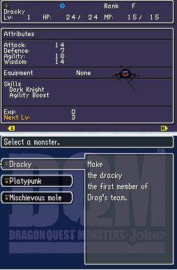 Mas chega de histórias, joguem por vocês mesmos. As mecânicas de jogo são muito parecidas aos Dragon Quest normais, pelo que as batalhas são por turnos, embora não sejam de encontros aleatórios, pois os monstros são visíveis no ecrã e só entramos em batalha se lhes tocarmos. Depois dentro de cada batalha podemos atacar, usar itens ou magia, defender, fugir, enfim, o normal. Felizmente que também podemos configurar uns presets de comportamentos e o combate acaba por se tornar automático a cada turno, com as personagens a tomar as decisões de acordo com o que prédefinimos, como usar muita ou pouca magia, atacar de forma cautelosa ou não se preocupar minimamente com a defesa. Por fim temos uma opção inteiramente nova, o Scout. É esta que nos permite capturar os monstros que encontramos. É essencialmente um ataque normal onde tentamos impressionar a criatura alvo da nossa força. Em cada golpe vai subindo um valor de percentagem no ecrã, e quanto mais próximo ficar dos 100% mais hipóteses temos de capturar a criatura. Mas para isso também temos de ter em conta o “rating” da criatura em questão e das que temos na nossa party. As mais fraquinhas têm um rating de F, com a escala a subir até ao A e depois os supra-sumos dos S e X. Se tentarmos capturar um monstro que tenha um rating superior aos dos nossos monstros, vamos ter uma vida difícil ao tentar capturá-lo.