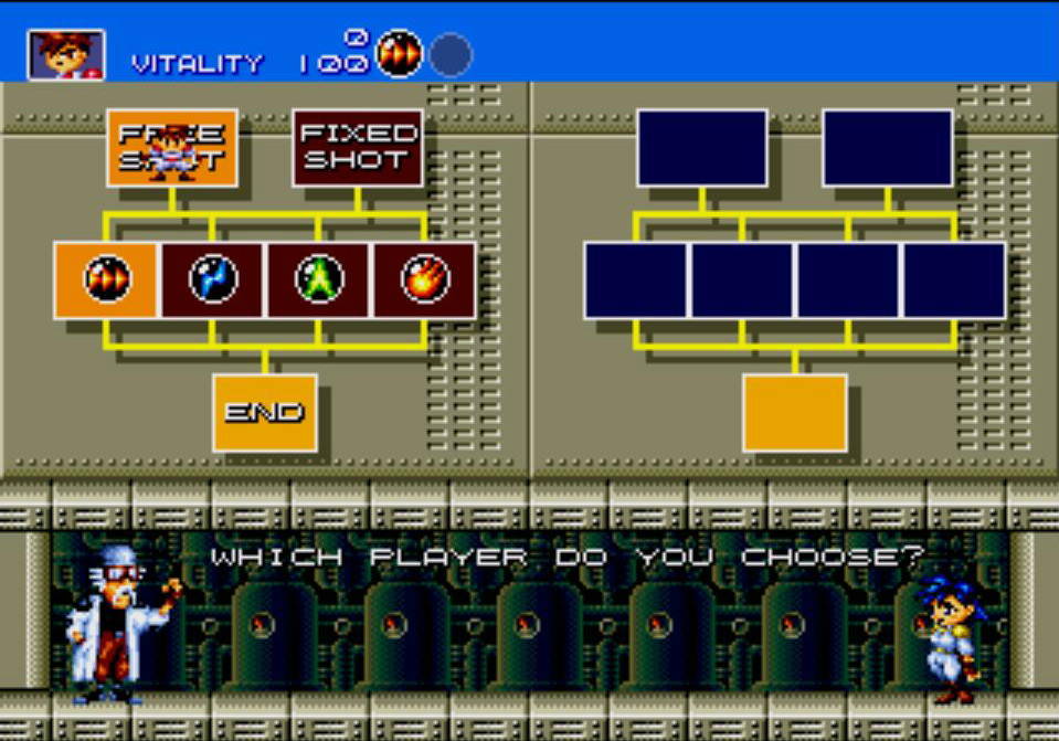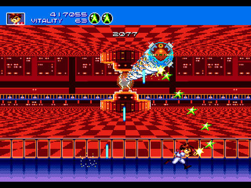 A história não é o que mais interessa. Basicamente coloca uma dupla de heróis (Blue e Red) no encalço de um poderoso império que procurava uns 4 cristais coloridos com poderes especiais, para os seus próprios proveitos. Mas aqui o que interessa é mesmo a acção e essa é non-stop, ao percorrer níveis bem variados, repletos de inimigos a surgirem por todos os lados e como a Treasure nos foi habituando, com imensos bosses também. Mas é igualmente na jogabilidade que este jogo marca pontos, onde podemos equipar e combinar 4 tipos diferentes de projécteis, resultando em 16 diferentes combinações. Com o “poder básico” de fogo, electricidade, “force e homing” conseguimos fazer coisas como mega lança chamas, espadas laser, raios laser teleguiados pelo ecrã, entre muitas outras variantes. E estas mudanças podem ser todas feitas “on the fly” à medida em que vamos encontrando esses power-ups espalhados pelos níveis. A única coisa que só conseguimos escolher no início do jogo e depois não dá para mudar é a possibilidade de podermos nos mover e disparar em várias direcções, ou mirar apenas enquanto estivermos parados. Mas para além de termos sempre imensos projécteis pelo ar, podemos também fazer uma série de coisas como arremessar os nossos inimigos, dar-lhes uns pontapés aéreos ou, no caso de estarmos a jogar com um amigo, também o podemos atirar para onde quisermos sem qualquer prejuízo. E por fim, o facto de termos pontos de vida (que vão sendo aumentados à medida que vamos progredindo no jogo) e não mortes ao mínimo toque, tornam este jogo bem dinâmico e muito menos frustrante que os Contras, mas também com essas liberdades de acção over-the-top.