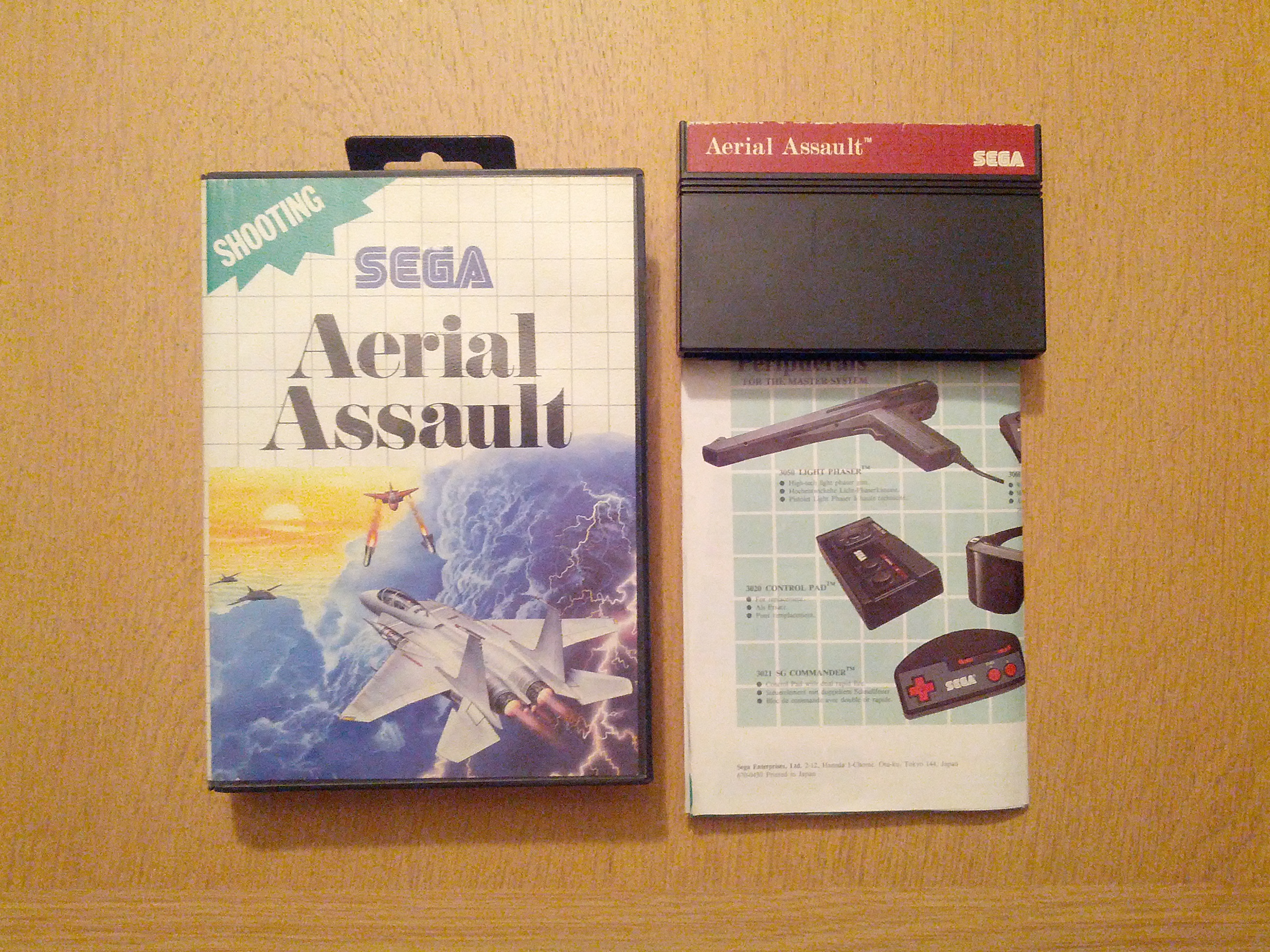 Para não variar, cá vamos a mais uma rapidinha! O jogo que cá trago hoje é mais um shmup, desta vez para a Master System. E sinceramente até foi um jogo que me surpreendeu um pouco, pois estava à espera de um shooter muito simples e este Aerial Assault até tem uns detalhes interessantes. De qualquer das formas foi daqueles jogos que comprei meramente por nostalgia, pois lembro-me de ver artwork desse jogo quando era mais novo e querer jogá-lo à força toda. Comprei-o há coisa de um ou dois meses atrás a um particular por cerca de 6, 7€.