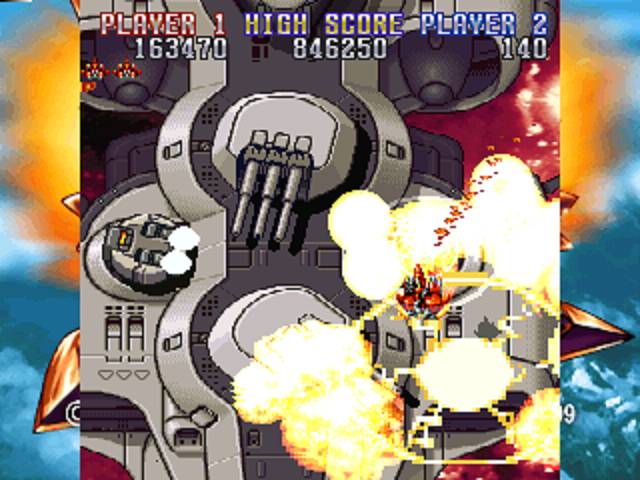 A jogabilidade não é nada complicada, afinal apenas podemos escolher uma nave e dispomos de um ataque normal, e outro especial capaz de provocar dano a practicamente tudo o que estiver no ecrã. Claro que o especial é para ser usado com moderação, embora em certos níveis até não seja muito difícil encher um stockzinho com essas munições. Depois temos também para além do pea shooter normal vários outros tipos de armas. Uma com mísseis teleguiados, o vulcan shot que se vai abrindo em leque e por fim a minha preferida, uma arma que lança raios eléctricos que são atraídos pelas naves inimigas, conseguindo com um só disparo atingir uma grande parte das naves no ecrã. De resto, é um jogo com uma jogabilidade simples conforme já referi, em que naturalmente a dificuldade vai aumentando à medida em que vamos progredindo no jogo. Para além do modo normal de história, poderemos encontrar outros modos de jogo de bónus, em que alguns até alteram completamente as coisas.
