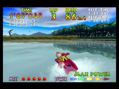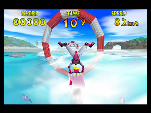 Aqui dispomos de vários modos de jogo, mas antes disso vamos às mecânicas básicas. Sendo este um jogo de corridas convém chegarmos em primeiro. Mas para além disso vamos vendo espalhadas nos circuitos várias bóias de cores vermelha e amarela. As vermelhas indicam que temos de as passar à sua direita, enquanto as amarelas pela esquerda. Cada vez que façamos isso correctamente acende-se uma setinha de “power” no ecrã, dando mais velocidade à moto de água. Por outro lado, por cada bóia que falhemos perdemos um nível de “power” e por conseguinte, um pouco de velocidade. Para além disso, ao falhar 5 bóias somos desqualificados da corrida, pelo que convém não abusar. Para além disso o jogo possui uma interessante física de ondulações e quando passamos por alguma rampa podemos fazer alguns truques enquanto estivermos pelo ar.