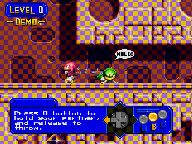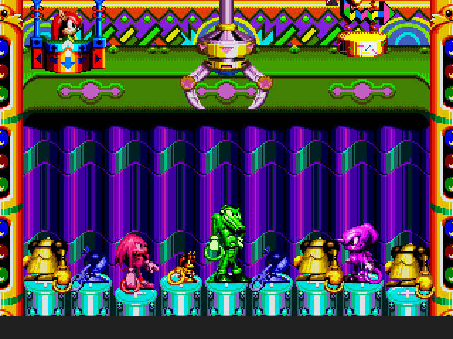 A história curiosamente é diferente na versão Japonesa e ocidental, embora apenas esteja descrita no manual (que por acaso não tenho) e não no jogo em si. Nesta versão o jogo é passado na tal Carnival Island, uma ilha com um parque de diversões todo high-tech e psicadélico, ilha essa alimentada por uma esmeralda do caos gigante (tal como no Sonic & Knuckles, presumo). Robotnik planeia sugar toda a energia libertada pela esmeralda e é com essa desculpa que Knuckles o tenta impedir. Pelo meio parece que Robotnik também raptou uma série dos seus amigos e a única maneira que Knuckles tem de os libertar temporariamente é através de uns anéis especiais, que os une através de um feixe de energia “elástica”. É uma história um bocado elaborada demais, mas o que interessa reter aqui é que o Chaotix é jogado sempre com duas personagens ligadas entre si com uma espécie de elástico. E como isso se traduz para o gameplay? Bom, como qualquer elástico, ao esticar vai acumular uma certa energia elástica que ao ser libertada traduz-se em grande velocidade. A ideia é usar essas propriedades elásticas para ver as duas personagens a fazer algumas acrobacias enquanto atravessam os níveis. É um bocado difícil de explicar, de tal forma que a Sega incluiu um segmento de tutorial antes do jogo “a sério” começar, que explica exaustivamente estas mecânicas de jogo e todas as suas possibilidades. Para jogar com mecânicas algo semelhantes aos Sonic clássicos… bom, basta pegarem na outra personagem ao colo e siga!