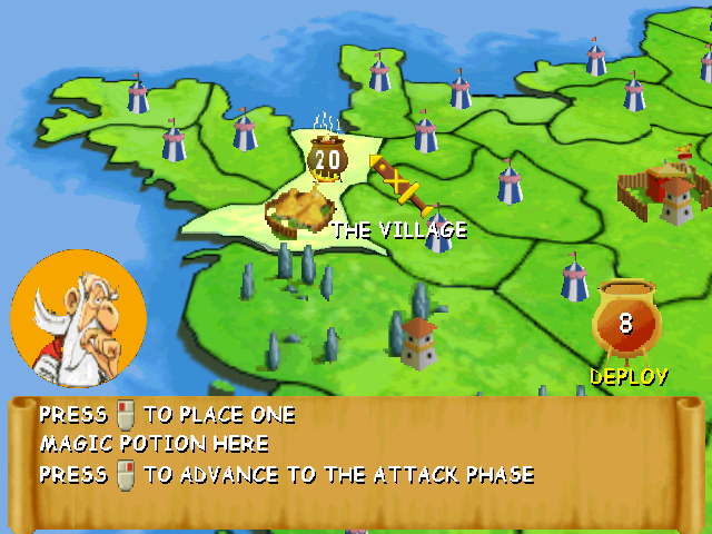 A história é relativamente simples. O druida Panoramix quer preparar uma nova poção misteriosa e pede a ajuda da mais famosa dupla de Gauleses para percorrer toda a Gália (aka França) para recolher os ingredientes necessários, cujo número varia mediante o grau de dificuldade seleccionado. Logo depois disso temos um mapa da Gália, que nos mostram as diferentes províncias do país, cada qual ocupada por acampamentos romanos. Nessa fase o jogo adquire um conceito de estratégia, pois para adquirir os ingredientes teremos de reconquistar toda a Gália aos romanos. Durante essa fase meramente estratégica temos de seleccionar territórios a conquistar aos romanos, bem como reposicionar os nossos reforços. Para isso temos de ter em conta a quantidade de reforços que temos e que podemos transportar de cada vez. Esse número está representado pelo número de caldeirões de poção mágica no ecrã, e cada tipo de acção pode ser executada apenas num número fixo de vezes. Em seguida é a vez dos romanos também se reforçarem, atacarem territórios conquistados por nós e reposicionarem-se. Temos de ter no entanto em conta que apenas podemos trazer reforços para territórios que possuem um caminho aberto até à nossa aldeia, pelo que se deixarmos os romanos conquistar um território que deixe outros isolados, não poderemos trazer reforços até restabelecer alguma linha que os interliguem.