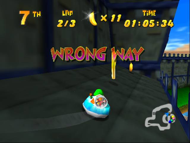 Mas felizmente a jogabilidade é excelente. Para além dos power-ups habituais, como boosts temporários de velocidade, óleo para despistar os adversários, ou mísseis tele-guiados para desfazer amizades de longos, aqui não conduzímos apenas karts, mas também poderíamos conduzir hovercrafts ou mesmo pequenos aviões, dando-lhe logo uma maior variedade que Mario 64. Depois por vezes temos também alguns itens secretos para encontrar como balões dourados espalhados pelo HUB ou chaves escondidas em circuitos. Essas chaves desbloqueiam alguns níveis de bónus que são na realidade simulações do modo multiplayer, que para além das tradicionais corridas em splitscreen, possui também vertentes similares ao capture the flag e deathmatch. De resto é um jogo com bastante longevidade, para quem o quiser completar a 100%. Apesar de o facto de nos obrigar a jogar os mesmos circuitos 3 vezes seguidas o que torna as coisas um pouco repetitivas, podemos ainda desbloquear uma personagem extra e o modo Adventure 2, que nos leva a uma “Master Quest” com os circuitos espelhados.