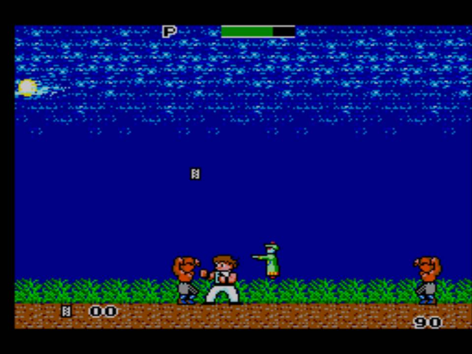 Bom, a história por detrás do Kung Fu Kid não sei, mas parece envolver o sobrenatural asiático pois eu nunca entendi muito bem contra quem é que estava a lutar. Temos criaturas pequenas a saltitar de um lado para o outro e que nunca consegui perceber o que eram, uns tipos castanhos que vim a saber mais tarde que eram lobisomens, e até uns tipos meios verdes que sempre me fizeram lembrar o Picollo de Dragon Ball Z. A jogabilidade é simples, com um botão para saltar e outro para atacar, sendo que podemos usar o botão de ataque em conjunto com os outros para outras combinações, como diferentes tipos de pontapés. Ao longo do jogo vamos também poder apanhar uns itens brancos que também nunca soube o que eram. E como na altura não tinha manual, nem internet para ler FAQs de jogos, nunca soube que eram talismãs e que se carregasse nos botões 1 + cima os podia atirar, destruindo todos os inimigos em que o tocassem. Quando era miúdo também tentava derrotar todos os inimigos que me surgiam no ecrã, e devido à falta de itens regenerativos, a minha barra de energia ia-se esgotando e por vezes não era suficiente para enfrentar o boss. Hoje em dia já aprendi que ganhamos mais em esquivar de alguns inimigos, saltando por cima deles. Dessa forma alguns até se atrapalham uns aos outros e a nossa vida fica um pouco mais facilitada.