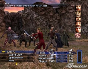 A jogabilidade pelo que me indicam é muito similar ao Final Fantasy X. Sim, ainda tenho esse jogo em fila de espera mas vai ser o próximo RPG que jogarei na PS2. Adiante, como ia dizendo, as batalhas são semi aleatórias, pois a maior parte das vezes apenas acontecem em momentos chave do jogo, não sendo tão aleatórias quanto isso. Mas entrando nos combates propriamente ditos, os mesmos são jogados por turnos, mas com um sistema dinâmico na alocação dos turnos, que dependem de algumas características das personagens em combate. Depois temos os Action Points, que são usados cada vez que usamos uma habilidade especial, sejam elas magias ou skills. Estas apenas evoluem não com os pontos de experiência normais de cada combate, mas sim com o uso. Cada vez que usamos uma skill ou magia ganhamos 1 ponto de experiência que servirá para desbloquear outras skills da mesma árvore.