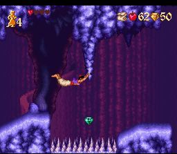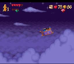 De resto, apesar de eu achar o Aladdin da Mega Drive um jogo muito melhor conseguido a nível técnico pelos seus gráficos muito bem detalhados e animados, a Capcom também se preocupou em fazer um bom trabalho nesse campo. Os níveis onde temos de andar de carpete mágica, como a fuga da caverna das maravilhas que se vê cada vez mais rodeada de lava, ou o passeio pelos céus de Agrabah com a Jasmine estão muitíssimo bem detalhados, tirando partido de alguns efeitos gráficos de sobreposição de planos que a SNES podia fazer. Para além disso, também vamos tendo várias cutscenes entre cada nível que nos vão acompanhando na história do filme. As músicas são também muito agradáveis, como não poderia deixar de ser.