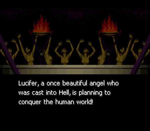 Este primeiro Megami Tensei é baseado no primeiro volume de uma trilogia de livros (Digital Devil Story de Aya Nishitani) lançados originalmente em meados dos anos 80 e que fizeram um sucesso considerável por terras nipónicas. No entanto, tendo estes jogos sido lançados originalmente num sistema 8bit, não esperem por uma narrativa tão rica quanto a de um livro, naturalmente. Aqui neste primeiro título a personagem principal é um jovem génio chamado de Akemi Nakaijima, que desenvolve um programa informático que lhe permite invocar demónios, tendo sido só esta ideia o que me deixou imediatamente intrigado com esta série. O Nakaijima por acidente acaba por invocar o próprio Lúcifer que por sua vez invade o mundo real, acompanhado por outros deuses como Loki e Set. Nakaijima, acompanhado da sua amiga Yumiko, acabam por ter de combater todas essas forças demoníacas e somos assim lançados para a aventura. Neste primeiro capítulo a história ainda é muito simples e o objectivo acaba mesmo por ser o de explorar as cavernas e defrontar os bosses que vamos encontrando, mas as coisas vão ficando mais interessantes com o tempo.