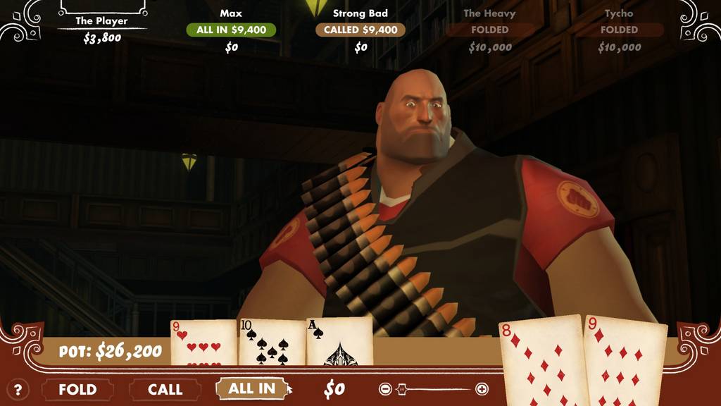 De resto, para além do upgrade gráfico bem notório desde o Texas Hold ‘em, vamos tendo tendo também vários desbloqueáveis, desde novos baralhos ou mesas de poker, com temáticas das diferentes series, e alguns itens para ganhar dos nossos 4 oponentes, que por sua vez poderão posteriormente ser desbloqueados no próprio Team Fortress 2.