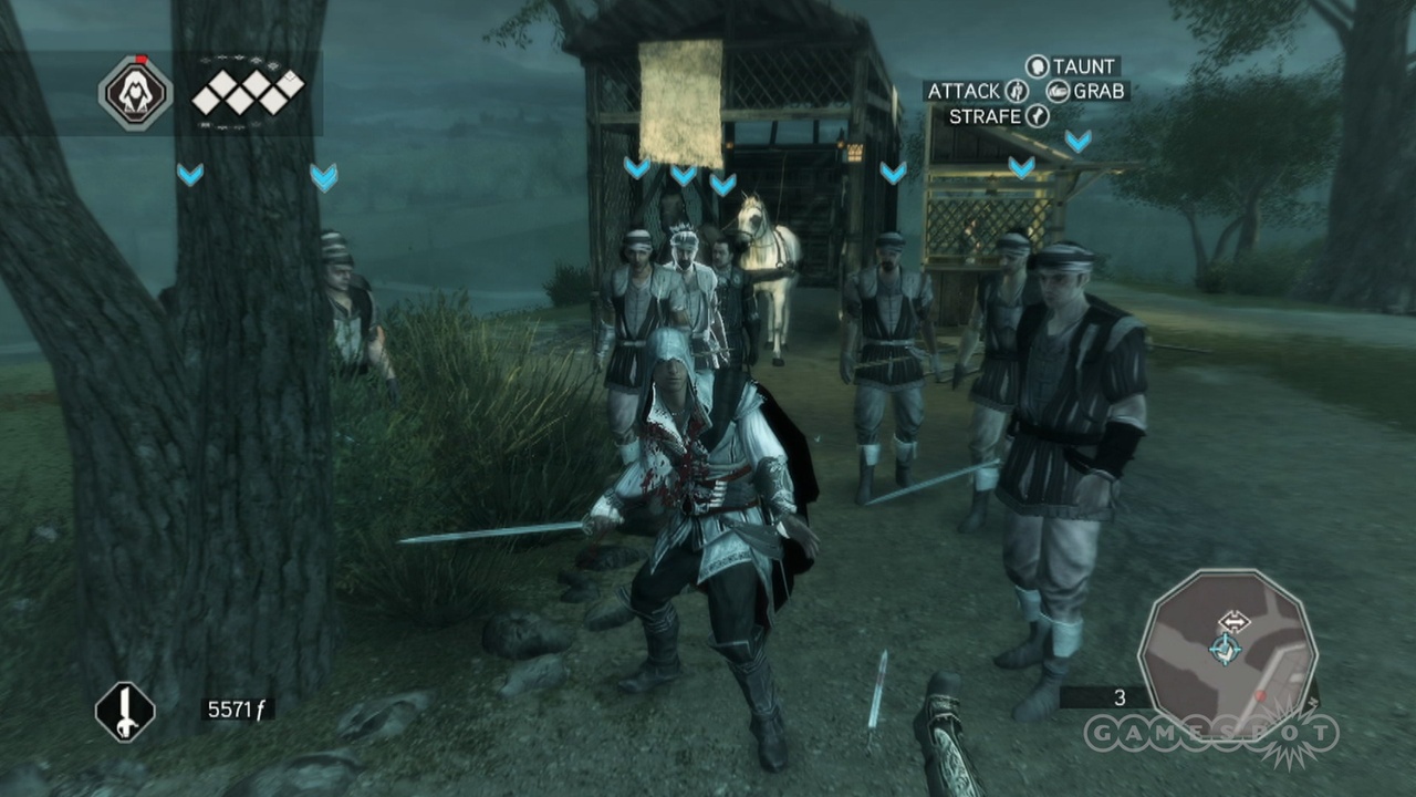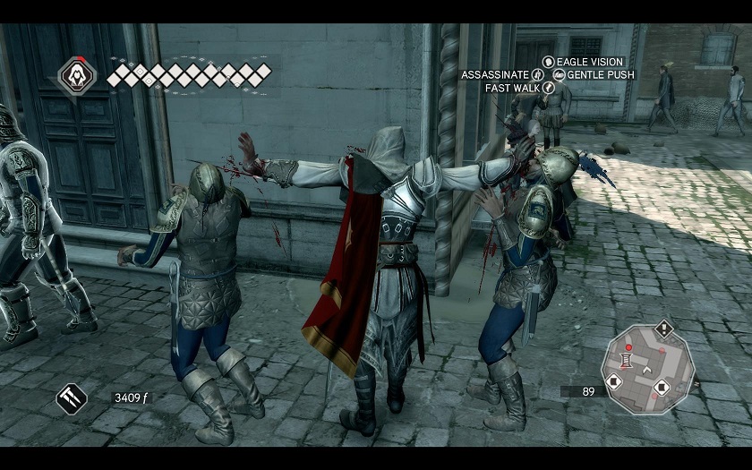 Claro que quando um guarda nos apanha a fazer algo de errado, temos duas hipóteses: ou combatemos ou fugimos. Fugir por vezes é a melhor opção e aí temos de nos afastar o suficiente e depois procurar um sítio onde possamos passar despercebidos, seja num fardo de palha, ou simplesmente misturado entre a multidão. Se decidirmos combater, bom, o combate também sofreu alguns melhoramentos face ao jogo original. Temos mais tipos diferentes de armas que podemos usar, incluindo uma lámina envenenada, bombas de fumo que atordoam os nossos inimigos, um pequeno revólver e no caso da lâmina escondida, a arma de marca dos assassinos, agora podemos equipar uma em cada mão, permitindo-nos assassinar 2 alvos em simultâneo, se estiverem juntinhos. De resto, para além de esquivar e contra-atacar, agora temos também a possibilidade de desarmar os inimigos.