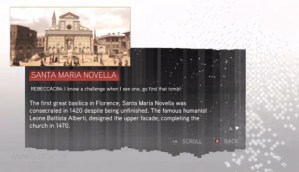 Ao longo do jogo vamos visitar as cidades de Florença, Toscana, Forli, Veneza, e parte de Roma (Vaticano), na recta final do jogo. À medida que vamos avançando no jogo e explorar as cidades, vamos preenchendo uma base de dados com dados históricos de várias localizações reais das cidades em questão, bem como pequenas biografias das várias personagens com que nos vamos cruzando. Não sei se são dados inteiramente verdadeiros (alguns certamente não são, para se adaptarem à ficção do jogo), mas são detalhes que me agradaram bastante.