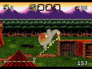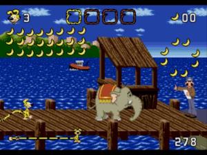 Por outro lado, o elefante é o ser mais burro de todo o sempre e sem dúvida o que mais frustração causa no jogo. Ele está constantemente a andar da esquerda para a direita, mudando de direcção se bater numa parede, se for atacado por um inimigo ou pela nossa cauda. Conseguimos imobilizá-lo temporariamente ao apanhar uns frutos e deixá-los no chão, fazendo com que ele pare por uns segundos para o comer. Pouco depois começa a andar novamente. Tendo em conta que por vezes temos de enfiar o elefante em plataformas elevatórias, mantê-lo sossegado até o elevador chegar e durante a viagem para não cair, temos de estar constantemente a atacar o elefante com a nossa cauda, fazendo-o mudar de direcção rapidamente, acabando por não sair muito longe. O jogo só teria a ganhar se pudessemos ordenar o elefante para parar quieto num sítio, assim sendo torna-se um pouco frustrante. Até porque temos um tempo limite para terminar cada nível, embora existam alguns powerups que nos extendam o tempo, pode não ser suficiente. Também temos powerups que nos regeneram a barra de energia.