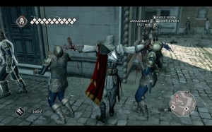 A nível audiovisual não tenho nada de especial a apontar. As personagens não estão incrivelmente detalhadas (excepto algumas das vestimentas de Ezio que possuem um bom nível de detalhe e animação). Por outro lado, as cidades estão muito bem representadas, gostei bastante de toda a atenção ao detalhe nesse sentido. No que diz respeito ao voice acting não tenho mesmo nada a apontar, está bastante competente e a narrativa é muito superior à do primeiro jogo, a meu ver. As músicas é que vão passando algo despercebido, mas num jogo com uma ambiência como o Assassin’s Creed é esperado, pois as músicas vão-se adaptando às situações. Isto é, tanto podemos ir ouvindo algumas melodias tipicamente renascentistas em plano de fundo, como a música irrompe com temas mais épicos quando estamos a combater e/ou a fugir.