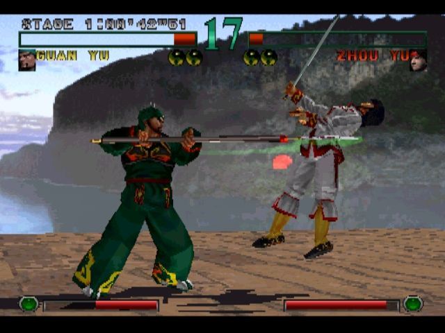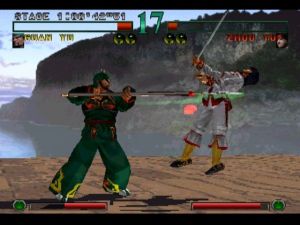A nível audiovisual sinceramente não acho que este jogo seja lá muito bom. É certo que saiu numa altura em que já tinhamos jogos como Virtua Fighter 2, Tekken 2 ou Soul Blade, mas aqui as personagens não têm o mesmo nível de detalhe, são mais “blocky“, e as animações poderiam ser mais fluídas. Os cenários também não são lá muito detalhados, com uma imagem estática de fundo. Têm é a particularidade de terem variantes para as diferentes fases do dia. Se tiverem a oportunidade de ler o manual, para além de uma breve biografia de cada lutador (inspirados em personagens reais), temos também uma descrição de cada uma das arenas de jogo, dando também detalhes históricos das batalhas reais que por lá decorreram, o que sinceramente já acho bem mais interessante. Temos também pequenas cutscenes de abertura e de fim, mediante a personagem escolhida, que também não são nada de especial, excepto a do zarolho que é provavelmente a cena mais gore que vi num videojogo… fui investigar à net e pelos vistos há mesmo a lenda que ele fez mesmo aquilo! De resto, sobre as músicas, nada de especial a dizer. Há algumas que eu gosto mais que outras, mas esperem ouvir aqui algumas melodias tradicionais orientais, bem como músicas com uma toada mais electrónica ou rock. Nada a apontar aos efeitos sonoros e às vozes, embora seja estranho que, num jogo carregado de história Chinesa, as personagens falem em Japonês.