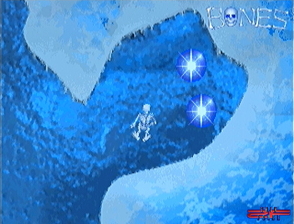 Depois temos as tais variações. Há níveis de plataformas onde temos de nos desenrascar com menos ossos, inclusivamente teremos de passar para o nível seguinte só com um número certo de ossos, como apenas uma perna e um braço, por exemplo. Temos níveis de perseguições onde temos de nos esquivar de troncos que estão a descer uma montanha de forma descontrolada, temos níveis quase em primeira pessoa onde Mr. Bones tem de nadar por uns túneis cheios de obstáculos, ou níveis com platforming mas com diferentes ângulos de câmara, como os do lago gelado que são vistos de cima, de baixo! Mais perto do final do jogo existe um nível muito parecido ao Asteroids da Atari, e temos os tais níveis rítmicos como o solo de guitarra ou bateria, que infelizmente só perdem por a jogabilidade não ser tão intuitiva como deveria. Por exemplo, o solo de guitarra obriga-nos a seguir uma série de riffs e leads, sendo que cada melodia está associada a um botão que devemos deixar pressionado até o lead terminar, sendo logo encadeado de seguida por outro botão. Isto vai muito na base da tentativa erro, o que infelizmente estraga um pouco o flow do jogo.