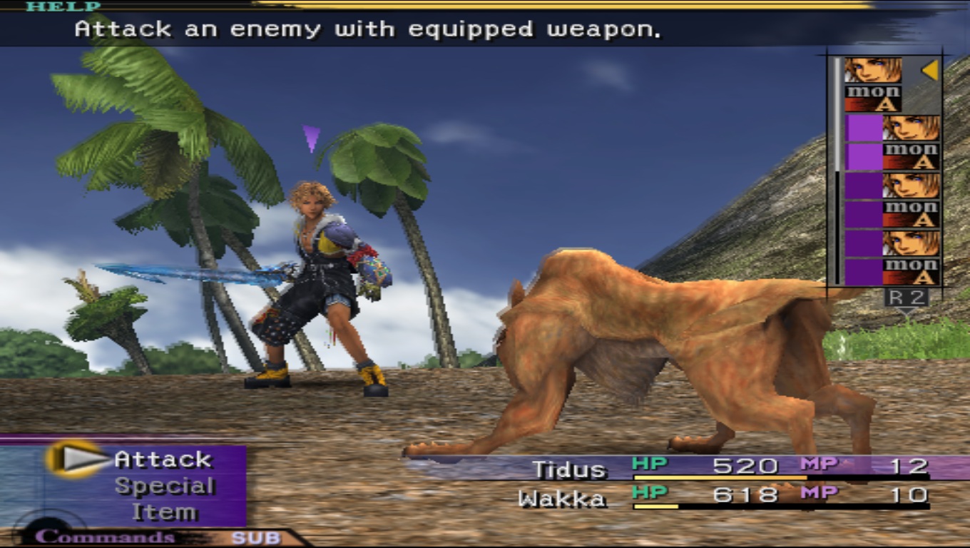 No que diz respeito à jogabilidade, há aqui também várias mudanças, a começar pelo sistema de combate. O Active Battle System utilizado em vários jogos da série desde o Final Fantasy IV foi substituido pelo Conditional Turn Based Combat System, que acaba por ser um sistema de combate por turnos onde podemos, sem qualquer pressão, levar o tempo que bem entendermos a escolher a acção a tomar. O “Conditional” tem a ver com as condições pelas quais a ordem dos turnos é atribuída (que pode ser vista no canto superior direito do ecrã). Tipicamente personagens com stats bem mais elevados possuem turnos mais cedo e mais frequentes que os oponentes. As acções que podemos desempenhar em combate são as habituais, com a possibilidade de usar ataques físicos, mágicos (para quem os tiver), ou skills físicas especiais que poderemos também ir aprendendo. No caso de Yuna, podemos também invocar os Aeons que tivermos actualmente à disposição. Mas ao contrário dos summons de outros Final Fantasy, que simplesmente apareciam no ecrã, lançavam um poderoso ataque e depois iam-se embora, aqui eles ficam em combate e podemos controlá-los livremente, atacando ou usando as suas habilidades especiais.