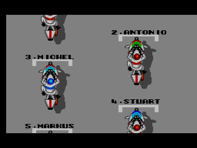 Bom, inicialmente dispomos de 3 modos de jogo, o Arcade onde conduzimos num circuito próprio, o Grand Prix, onde temos uma temporada pela frente ao longo de vários circuitos e por fim temos também o Tournament mode, onde poderemos escolher livremente em quais pistas queremos concorrer e a sua ordem. Mas a primeira coisa que salta à vista neste jogo é, quer joguemos sozinhos ou com um amigo, o jogo está sempre em split screen. Para além disso, o jogador 1 é sempre o da parte inferior do ecrã, o que é o contrário do habitual e no início ainda me confundiu bastante.