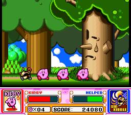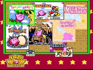 Portanto inicialmente dispomos de vários jogos (e dois mini-jogos) que poderemos jogar, até que vamos desbloqueando mais alguns, tendo um total de 7 jogos e 2 mini jogos para explorar num só cartucho. O Spring Breeze é um remake (simplificado) do Kiby’s Dream Land, O Dyna Blade coloca-nos a atravessar uma série de níveis para depois defrontar o Dyna Blade, um pássaro gigante que andava lá a aterrorizar a população. O Gourmet Race é um subjogo de corridas onde defrontamos o rei Dedede numa série de níveis de plataforma. Aqui o objectivo não é necessariamente o de chegar em primeiro lugar (embora isso também seja recompensado) mas sim o de apanhar mais comida!