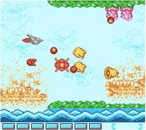 Por fim, deixei o melhor jogo, a adaptação do Parodius, que por sua vez é uma paródia à série Gradius, herdando muitas das suas mecânicas de jogo (e do TwinBee também). Aqui podemos jogar com várias “naves” diferentes, incluindo um polvo voador, pelo que logo desde cedo dá para entender que este é um jogo que não se leva muito a sério. E o design dos níveis assim o comprova, onde iremos defrontar bosses bizarros como animais gigantes, estátuas da ilha da Páscoa ou até uma bailarina em trajes de Cabaret. O jogo herda o mesmo sistema de power ups de Gradius, e do TwinBee, na medida em que podemos disparar várias vezes para sinos que depois, se os apanharmos nos podem dar pontos extra, vidas extra ou outros powerups adicionais, como invencibilidade temporária.