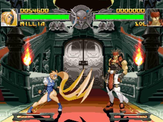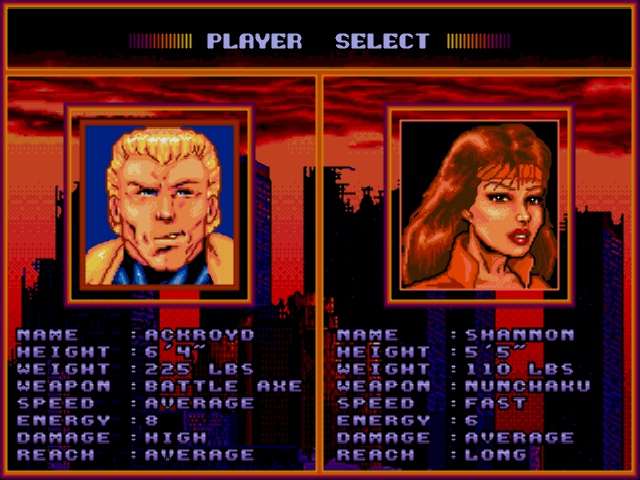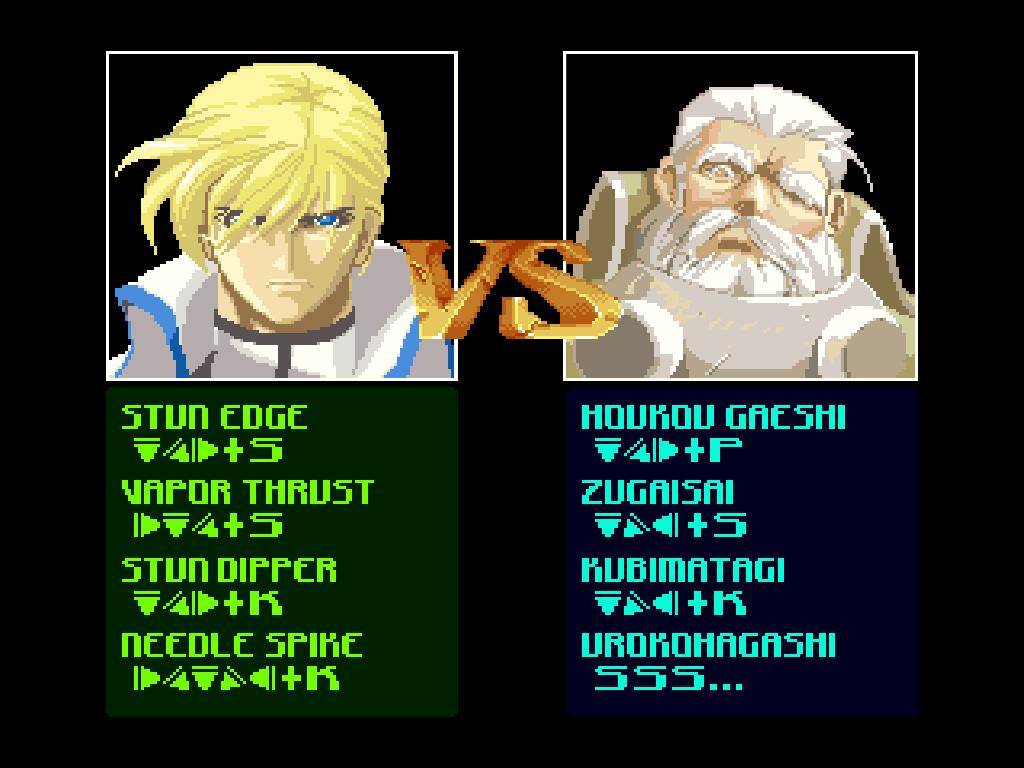 Dispomos de 6 botões faciais para usar, dois deles para socos ou pontapés, outros 2 para usar armas brancas, e outros 2 usados para desencadear alguns ataques especiais. O jogo possui um bom sistema de combos, que resultam numa jogabilidade muito frenética e exige mesmo reflexos rápidos para usar counters no momento certo e quebrar o ímpeto do inimigo. Tal como em muitos outros jogos de luta da época temos também uma barra de “tensão” que vai aumentando consoante a nossa performance no jogo, e que, uma vez cheia, nos pode fortalecer e desbloquear alguns golpes mais poderosos. Se formos habilidosos (o que certamente não é o meu caso), podemos também desencadear alguns golpes que derrotam o inimigo instantaneamente, uma espécie de fatality que pode acontecer a meio do combate. De resto os modos de jogo são simples: o arcade que contém também a história para cada um dos lutadores, o versus para 2 jogadores e um modo de treino que podemos usar para practicar os movimentos de cada personagem.