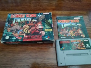 Para os entusiastas de videojogos da minha geração, é difícil não olhar para a era das 16bit sem um certo saudosismo. Em vários pontos do mundo vivia-se a melhor “guerra” de consolas de sempre onde os vencedores eram sempre os jogadores, pois tanto a Mega Drive como a Super Nintendo viriam a receber jogos de muita qualidade. Aqui em Portugal nunca se sentiu tanto essa luta, pois a Sega tinha larga vantagem cá e a Super Nintendo, para além de ter videojogos bem mais caros, tinha uma distribuição e marketing que deixava bastante a desejar. Mas em 1994, pelo menos nos Estados Unidos, a disputa entre Mega Drive e Super Nintendo estava bem acirrada e equilibrada. No entanto dizem muitos historiadores da área que a balança começou a pender definitivamente para o lado da Nintendo a partir do momento em que este Donkey Kong Country foi lançado. Mas afinal o que tinha este jogo de tão espectacular? É o que já veremos em seguida. O meu exemplar foi comprado algures em Junho deste ano que está prestes a terminar, custou-me 12€ numa Cash Converters em Lisboa. EDIT: Recentemente surgiu uma cópia completa na Cash Converters do Porto por 15€, aproveitei.
