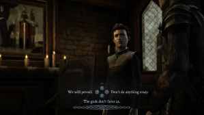 Depois do sucesso de Walking Dead, a Telltale repetiu aquelas mecânicas de jogo noutras obras como Wolf Among Us, Tales of the Borderlands, ou este Game of Thrones. A história deste jogo começa com os eventos do Red Wedding, onde encarnamos no jovem Gared Tuttle, escudeiro de Lord Gregor Forrester, uma importante família do Norte de Westeros e aliada dos Starks. Quem for fã da série/livros sabe perfeitamente o que aconteceu nesse casamento, pelo que muita gente morre e a família Forrester fica em muito maus lençóis. Ao longo dos 6 capítulos que compõe este jogo, iremos encarnar em Gared e vários outros membros da família Forrester, de forma a tentar a assegurar a sobrevivência e independência daquela Casa.