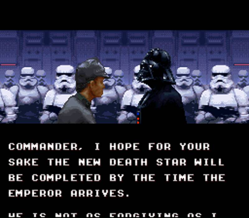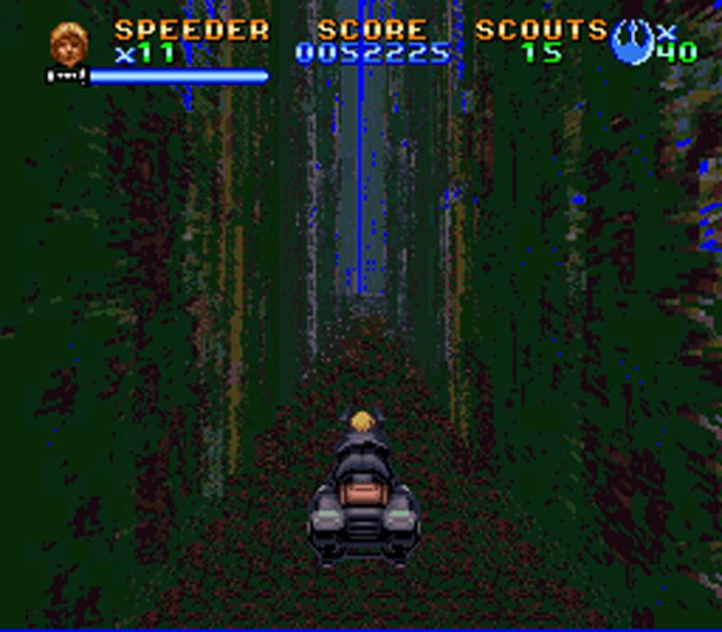 Por fim só falta mesmo referir os segmentos onde conduzimos veículos. Tal como nos dois jogos anteriores, estes usam o efeito mode 7 para simular gráficos 3D e fazem-no muito bem, muito mais credíveis do que F-Zero ou Mario Kart. O primeiro nivel é um desses, onde conduzimos um Landspeeder até às imediações do palácio de Jabba. Depois temos a perseguição em Speeder Bikes no planeta de Endor que usa uma espécie de mode 7 duplo para simular vegetação à esquerda e direita e onde teremos de nos desviar de alguns obstáculos, para além de combater as forças imperiais – estava bastante curioso como é que iriam implementar esta parte e, apesar de infelizmente a jogabilidade não ser a melhor, tecnicamente o resultado foi interessante. Depois temos um nível onde estamos parados no Milennium Falcon e temos de destruir um certo número de Tie Fighters. Aqui podemos rodar o ecrã, num interessante efeito 3D, mas infelizmente mais uma vez a jogabilidade não é a melhor, sente-se a falta de um radar que nos indique de onde vêm os inimigos. Depois temos mais um nível onde conduzimos a Millenium Falcon à superfície da Death Star e a fase final é precisamente quando nos aventuramos num túnel para a destruir por dentro. Uma vez mais aqui é usado um estranho efeito mode 7 que nos dá a sensação de estar a percorrer um túnel em 3D. No entanto não é muito claro onde são as paredes e com todos os Tie Fighters a surgir de todos os lados torna este nível também um pouco frustrante.