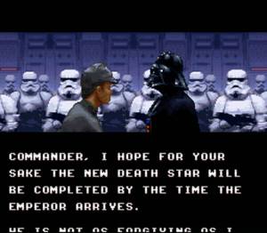 O jogo segue uma vez mais, de uma forma relativamente fiel (afinal isto é um jogo de acção) os eventos do filme, começando precisamente com o resgate de Han Solo das mãos de Jabba the Hut, a viagem para Endor onde conhecemos os Ewoks e o confronto final com Vader, o Imperador Palpatine e a destruição da nova Death Star. Notei neste jogo alguns desvios maiores da história do filme logo no segundo nível, onde, chegando às portas do palácio de Jabba, podemos escolher jogar com Leia (disfarçada de bounty hunter), Luke ou Chewbacca. Mas só no nível seguinte (já com Leia aprisionada por Jabba) é que fazia sentido jogar com Luke ou Chewbacca. Mas continunando…