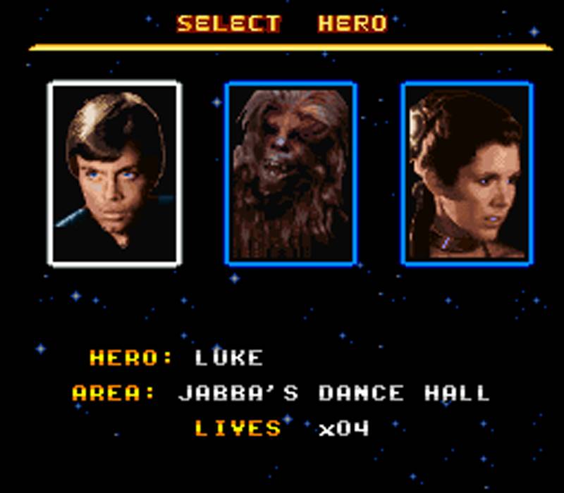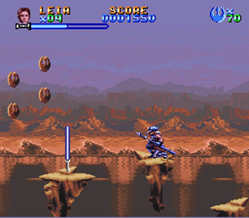 A primeira diferença face ao jogo anterior é precisamente a maior liberdade de escolha de personagens em vários dos níveis de plataformas, tal como aconteceu no primeiro Super Star Wars, mas no Empire Strikes Back a escolha da personagem jogável era sempre restringida. O caso de Leia em particular é o mais interessante, pois nos níveis em que a podemos seleccionar, ela possui diferentes vestimentas, armas e habilidades. Se jogarmos com Leia vestida de bounty hunter, ela está equipada com uma lança que é capaz de carregar e disparar uma onda poderosa de energia. Se jogarmos com Leia no nível após a sua libertação, ela já está com aquele “bikini” de escrava e usa como arma uma morning star, uma vez mais capaz de carregar e disparar projécteis de energia – quase que parece um chicote dos Belmont! Por fim, a última aparição de Leia já a permite usar um Blaster, que, tal como nos jogos anteriores, pode ter vários upgrades diferentes.