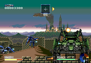 A história é simples e envolve uma guerra interplanetária qualquer, da qual nós fazemos parte, estando equipados de um poderoso mecha de nome Ranger-X, mas também com o suporte de outros veículos, como um monociclo todo high-tech ou uma nave maior que também nos irá acompanhar em alguns níveis. Mas a primeira coisa que vos devo mesmo dizer é que os controlos deixam muito a desejar, pois não são assim tão intuitivos. O jogo suporta comandos de 6 botões, que por si só já nos dá um pouco mais de controlo, mas ainda assim as coisas não são tão intuitivas quanto poderiam ser. Senão vejamos: Ranger-X é um mecha, onde o botão direccional serve para o movimentar pelo ecrã. Ao carregar no direccional para cima, activamos um propulsor que nos deixa voar durante algum tempo (isto porque eles sobreaquecem ao fim de alguns segundos, pelo que teremos de o usar com alguma precaução). Os botões faciais servem para disparar a arma standard para a esquerda ou direita (botões A e C respectivamente), enquanto que carregar o botão B serve para disparar a arma especial que temos equipada.