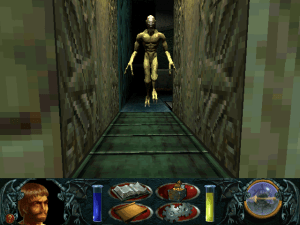 Ao longo do jogo não existem quaisquer vendedores, pelo que nos teremos de equipar e munir de poções com o que vamos encontrando, ou com o que os inimigos vão largando quando os derrotamos (e sim, armas e armaduras possuem durabilidade limitada). A aventura em si é jogada numa perspectiva de primeira pessoa, já com este jogo a integrar um controlo semelhante ao WASD + rato que usamos actualmente. No entanto, para melhor interagir com itens, botões/alavancas ou mesmo alguns dos ícones do jogo no visor, ao manter o Enter pressionado, surge um cursor no ecrã que podemos controlar para melhor seleccionar o que desejarmos. E claro, como muitos outros RPGs, aqui também podemos assignar uma série de hotkeys a várias acções diferentes, como usar poções ou alguns determinados feitiços. No entanto nem tudo são rosas e se há coisa que não entendo como é que a Bethesda achou que isto era boa ideia foram as mecânicas de saltos. Ao invés de termos uma tecla para saltar como é comum em qualquer outro videojogo, aqui temos de pressionar (e manter pressionado) o botão ALT, que faz surgir uma pirâmide invertida no ecrã que se vai afastando de nós enquanto mantivermos a tecla premida. Essa pirâmide serve de controlo até onde queremos saltar, ou seja, deixamos o “cursor” se movimentar até onde queremos saltar e soltamos a tecla. Não era melhor simplesmente… saltar? Assim parece que estou a conjurar um feitiço qualquer… O combate também não é tão dinâmico quanto em jogos mais recentes, pois por exemplo, se usarmos uma espada ou outra arma branca, atacamos ao premir o botão do rato e, com o botão do rato premido, movimentamos o rato na direcção em que queremos fazer o corte – sim, isto já acontecia no Arena e no Daggerfall.
