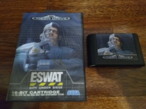 Cyber Police E-Swat é um jogo de acção da Sega que foi lançado nas arcades em 1990. Apesar de ter também um polícia com uma armadura high-tech como protagonista (claramente inspirado em Robocop) esse jogo possuia mecânicas de jogo na verdade muito similares ao Shinobi, na medida em que podíamos saltar entre 2 planos distintos em várias ocasiões. Quando o jogo foi convertido para a Master System e Mega Drive, cada uma dessas conversões acabou por se tornar um jogo diferente. Este meu exemplar da versão Mega Drive foi comprada em Feveiro a um particular no Reino Unido custou-me algo em torno dos 15€.