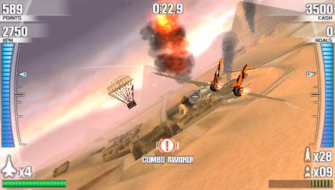 As mecânicas de jogo são simples. Um botão para disparar rajadas de metralhadora (que possuem munições infinitas), outros dois  para disparar mísseis (sejam ar-ar ou ar-terra), sendo que para disparar os mísseis convém esperar que os alvos estejam trancados no ecrã, caso contrário é um desperdício de recursos. Por outro lado também temos de evitar levar com mísseis, pelo que teremos de fazer uns barrel-rolls sempre que isso aconteça. Nas laterais do ecrã temos também um medidor do After Burner, que vão esvaziando sempre que activamos os turbos, sendo depois restabelecidos automaticamente. Temos também, no canto inferior esquerdo do ecrã, a barra de “vida” do avião que se vai esvaziando à medida que somos atingidos e tipicamente temos 3 vidas em cada missão. Para além disso muitas vezes ao destruir aviões inimigos são largados pára-quedas de diferentes cores que podemos apanhar. Uns restabelecem os mísseis que temos disponíveis, outros dão-nos dinheiro extra (também recebemos dinheiro sempre que destruímos alguma coisa), outros restabelecem os escudos do nosso avião. Há também uns páraquedas rochos que nos dão um efeito matrix durante alguns segundos, onde tudo se move em câmara lenta e podemos aproveitar isso para conseguir lockar aviões inimigos, ou desviarmo-nos de mísseis inimigos em segurança.