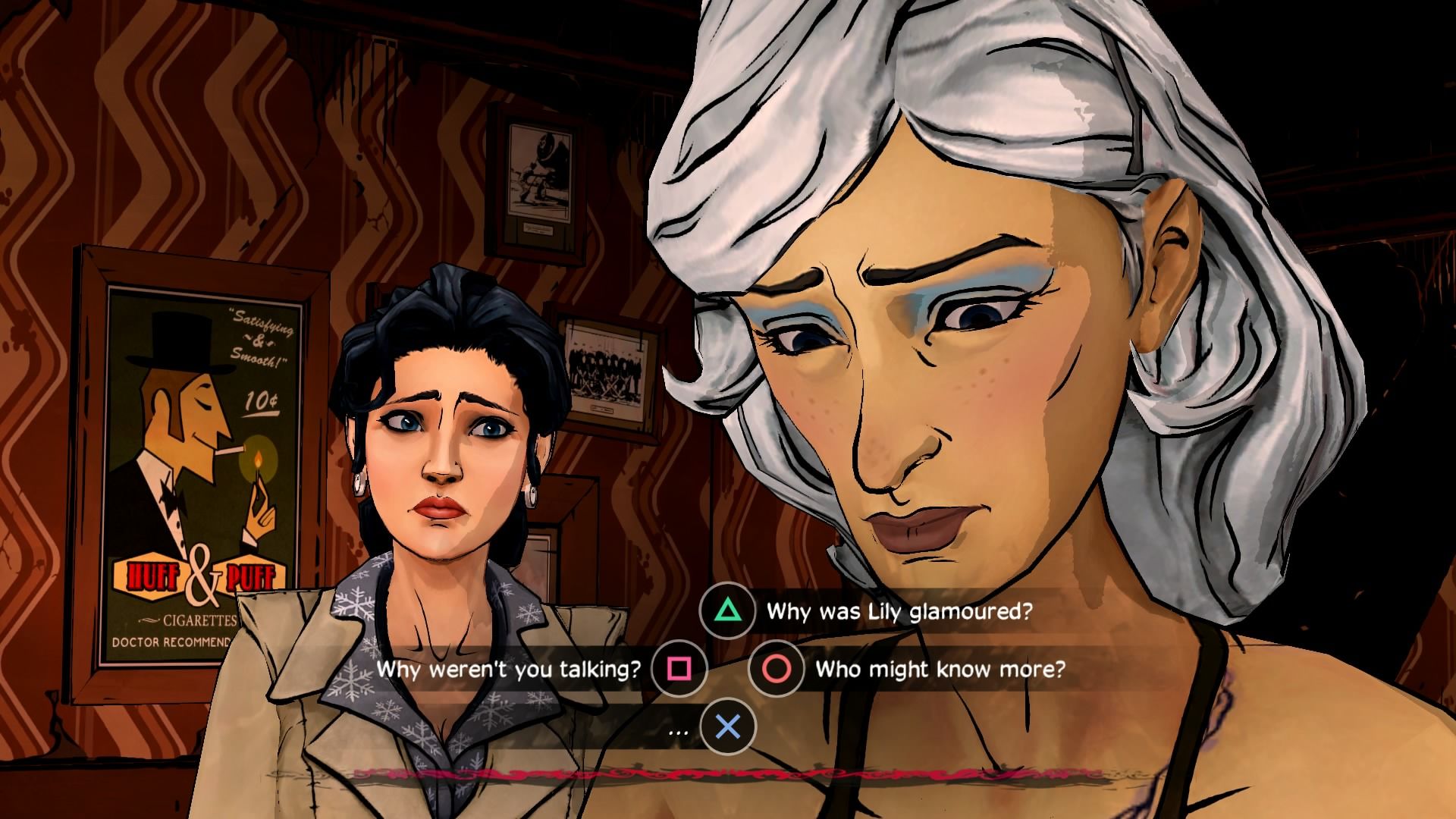 No que diz respeito às mecânicas de jogo, estas são muito similares às de Walking Dead, sendo um jogo de aventura gráfica com várias sequências de acção compostas por Quick Time Events, onde temos de seguir as indicações visuais no ecrã de que botões devemos pressionar naquela altura. Temos alturas de exploração, onde podemos nos movimentar não tão livremente quanto isso ao longo dos cenários e interagir com objectos ou outras personagens, que são sinalizados no ecrã, facilitando-nos a tarefa de ter de procurar coisas com que interagir. Ocasionalmente podemos apanhar alguns itens que podem posteriormente ser usados para interagir com outros objectos, ou mesmo com outras personagens através dos seus diálogos. Para os diálogos temos um tempo limite para responder, e caso não escolhemos nenhuma resposta, Bigby mantém-se em silêncio, o que por si só já é uma resposta válida, e pode alterar um pouco a forma como as personagens à nossa volta nos percepcionam, ou mesmo alterar ligeiramente os acontecimentos seguintes.