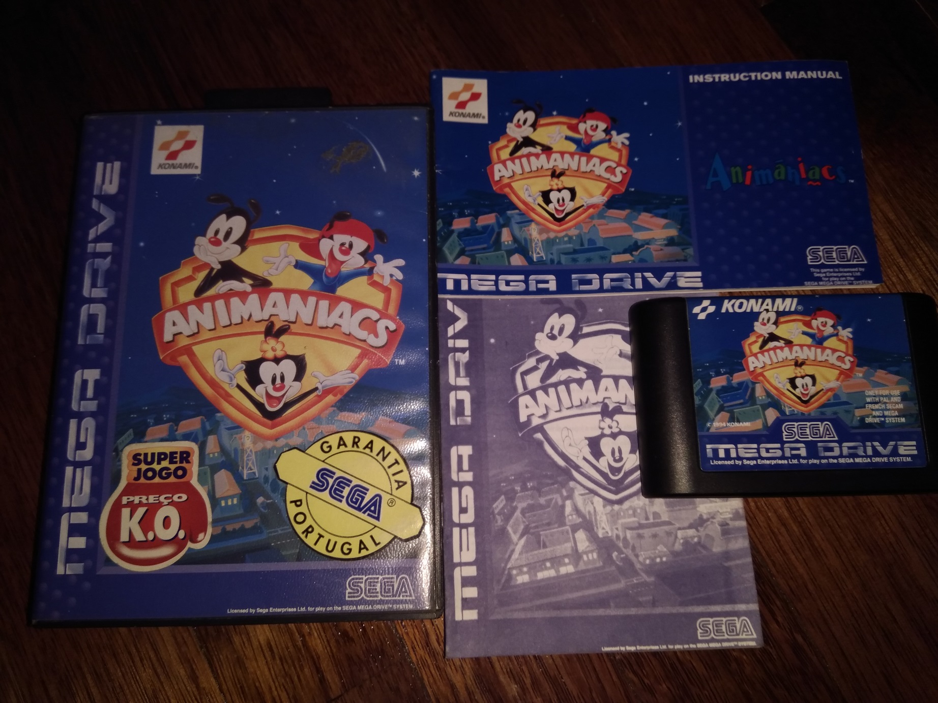 Uma das minhas séries de animação preferidas dos anos 90 foi sem dúvida os Animaniacs, da Warner Bros. Introduzindo 3 personagens tresloucadas (Yakko, Wakko e Dot), esta era uma série de animação cheia de humor absurdo, como muitos outros clássicos de animação da mesma década. E claro, introduziu-nos também a dupla de ratos Pinky e Brain, que ainda hoje deve estar a magicar um plano qualquer para dominar o mundo. A certa altura nos anos 90, a Konami detinha a licença para adaptações desta série em videojogos acabando por produzir 2 videojogos diferentes para a Mega Drive e Super Nintendo. O meu exemplar da Mega Drive foi comprado algures no mês de Janeiro num bundle grandinho de vários jogos, tendo-me ficado a menos de 5€ cada.