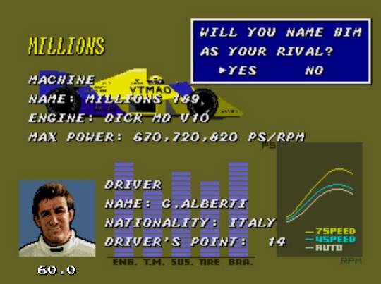 A versão Mega Drive ganhou então um modo de jogo inteiramente diferente, o “World Championship”, que conforme o nome indica, teremos uma temporada inteira pela frente. Começamos a nossa carreira numa equipa modesta e o objectivo é ganhar a competição ao fazer mais pontos que os outros pilotos. Temos no entanto aqui um interessante sistema de rivalidades, onde somos convidados a escolher um rival de uma equipa adversária para competir directamente. Se terminarmos duas corridas à frente do mesmo rival, a equipa pela qual ele compete oferece-nos um lugar na sua equipa e se o aceitarmos, o rival é despedido, sendo posteriormente contratado por uma equipa mais fraca. Ora isto é um conceito interessante mas deve ser usado com precaução, pois caso sejamos nós a perder os confrontos directos, também somos penalizados. Se conseguirmos vencer na primeira temporada, somos convidados a competir pela equipa Madonna (equivalente à McLaren, que em 1989 era a melhor equipa da prova) e teremos depois uma segunda temporada para defender o primeiro título.