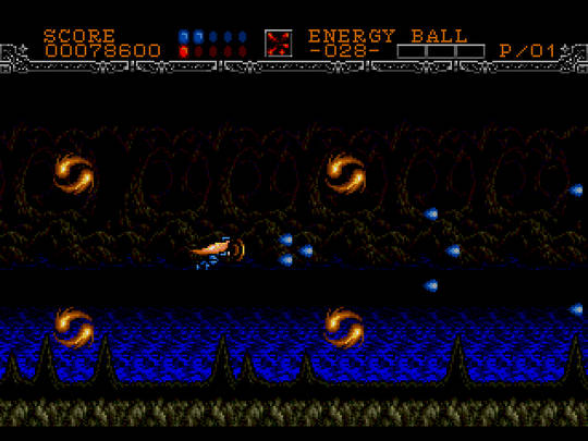 Agora que temos as mecânicas de jogo cobertas, passemos para os visuais. Apesar de ser um jogo lançado ainda relativamente cedo no ciclo de vida da consola (saiu originalmente no início de 1991 no Japão), é um jogo graficamente muito capaz, principalmente nos bosses e cenários que estão muitíssimo bem detalhados. Estes últimos estão repletos de efeitos de parallax scrolling, e ocasionalmente alguns efeitos especiais de distorção ou rotação de sprites que me agradam bastante. Mas para além disso, os cenários em si, bem como os inimigos estão muito bem desenhados, indo buscar imensas inspirações diferentes, sejam cenários que nos remetam para antigas civilizações romanas ou gregas, o steampunk, ou mesmo aqueles designs sinistros e biomecânicos que H.R. Giger tão bem nos deu a conhecer. Face a esta variedade de temáticas nos cenários e inimigos, as músicas são também bastante ecléticas e agradáveis, oscilando entre temas de composição mais clássica, outros mais folk ou modernos.